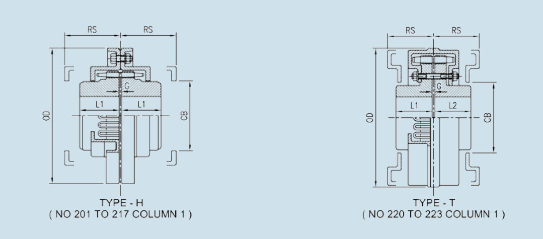 | Coupling No. | Rating HP/RPM | Clear Dia. OD (MM) | Boss Length L1 (MM) | Boss Length L2 (MM) | Removal Space RS (MM) | Gap G (MM) | Cover Bore CB (MM) | Safe Speed RPM | Stock Rough Bore (MM) | Bore Max. (MM) | Approx. Weight KGS |